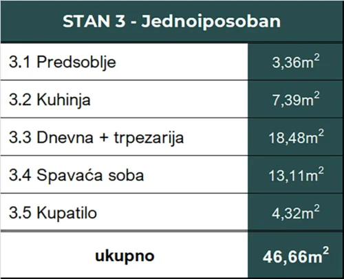 plaćaš površinu stana od 46,66m2 a plus dobijaš gratis impozantnu terasu-baštu oko 10m2 koja predstavlja prostor za uživanje a stanu pruža obilje svetlosti i energije